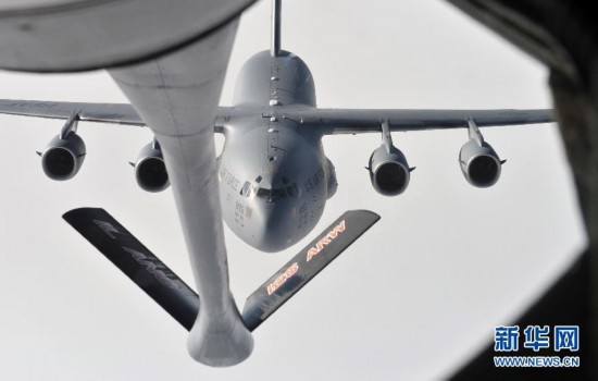 2011年12月18日,一架由阿富汗飛往吉爾吉斯斯坦的美軍C-17軍用運(yùn)輸機(jī)(后)配合KC-135空中加油機(jī)進(jìn)行空中加油。C-17軍用運(yùn)輸機(jī)載重量具有高度靈活性,既可以完成遠(yuǎn)程戰(zhàn)略投送,也能勝任戰(zhàn)術(shù)運(yùn)輸和空投任務(wù)。C-17最大載重近78噸,空中加油后最大航程達(dá)11600公里。新華社/法新