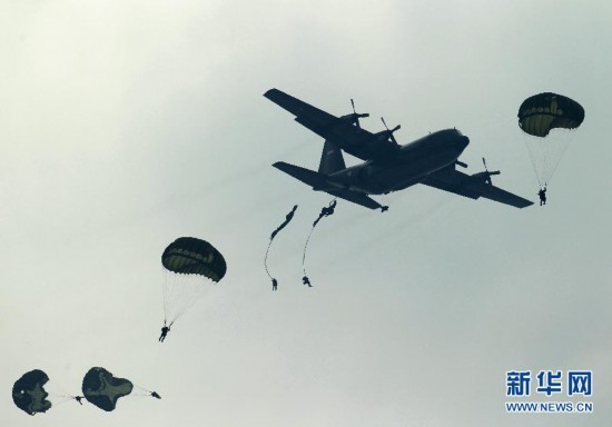 2012年10月5日,在印度尼西亞雅加達(dá)附近舉行的印尼建軍67周年紀(jì)念活動(dòng)上,印尼空降兵從C-130軍用運(yùn)輸機(jī)上跳傘。C-130軍用運(yùn)輸機(jī)綽號(hào)“大力神”,是目前美國(guó)服役時(shí)間最長(zhǎng)、生產(chǎn)數(shù)量最多的現(xiàn)役運(yùn)輸機(jī)。由于C-130系列性能優(yōu)秀、改型眾多,全球有超過(guò)70個(gè)國(guó)家和地區(qū)使用其相關(guān)機(jī)型。新華社/路透