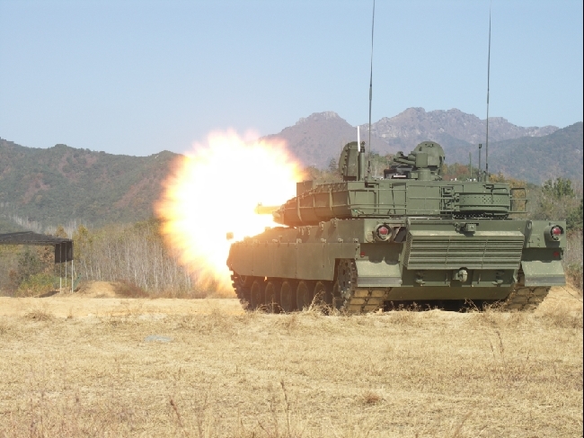 K2曾經(jīng)考慮采用140mm的滑膛炮,由于導(dǎo)致整車過重而最終采用萊茵金屬集團(tuán)生產(chǎn)的55倍口徑120mm L55滑膛炮作為主炮。該炮與“豹”2A6的主炮一樣,膛壓高,初速高,配用尾翼穩(wěn)定脫殼穿甲彈和多用途彈。在使用德國(guó)最新的DM53穿甲彈情況下,可在2000米處穿透800毫米厚的鋼裝甲板。據(jù)悉,韓國(guó)為K2坦克專門開發(fā)了型號(hào)為K276的鎢芯穿甲彈,可在1000米擊穿700毫米的均質(zhì)鋼裝甲,威力雖遜于DM53穿甲彈,但已超過美軍早期貧鈾彈的水平。