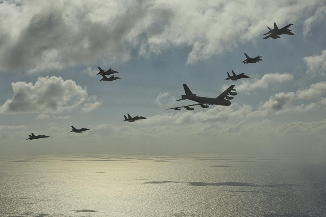 圖為參加軍演的美軍B-52引領(lǐng)各國(guó)戰(zhàn)斗機(jī)編隊(duì)飛行