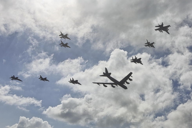 參加軍演的美軍B-52引領(lǐng)各國戰(zhàn)斗機編隊飛行