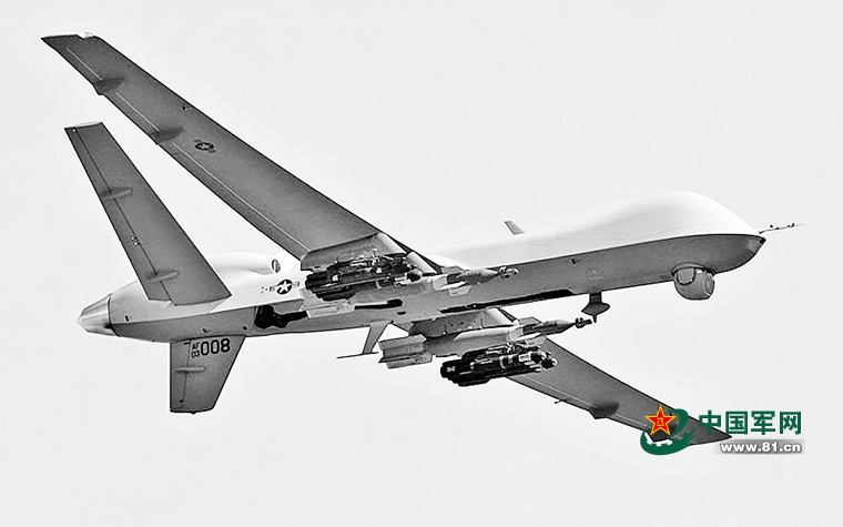 MQ-9“死神”無人機(jī)攜帶有多光譜瞄準(zhǔn)系統(tǒng)和激光制導(dǎo)彈藥的激光測距儀/指示器,機(jī)上裝備6個武器掛架,可搭載包括“地獄火”導(dǎo)彈、GBU-38聯(lián)合直接攻擊彈藥等近300千克炸彈。