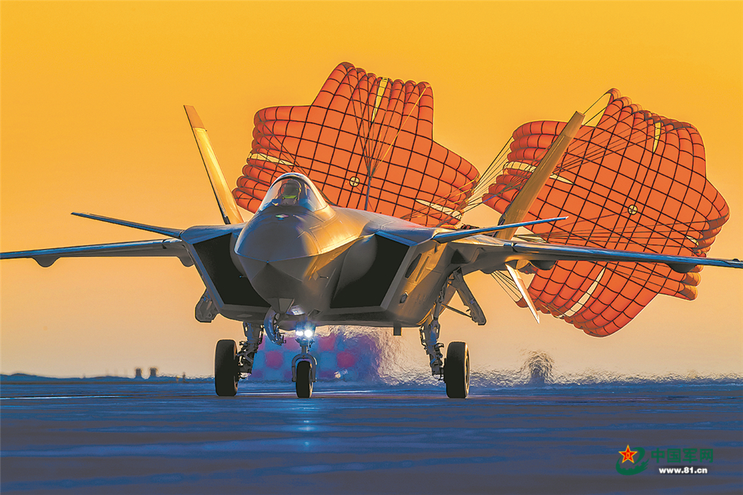 訓(xùn)練返航,戰(zhàn)機(jī)拖著減速傘滑行。