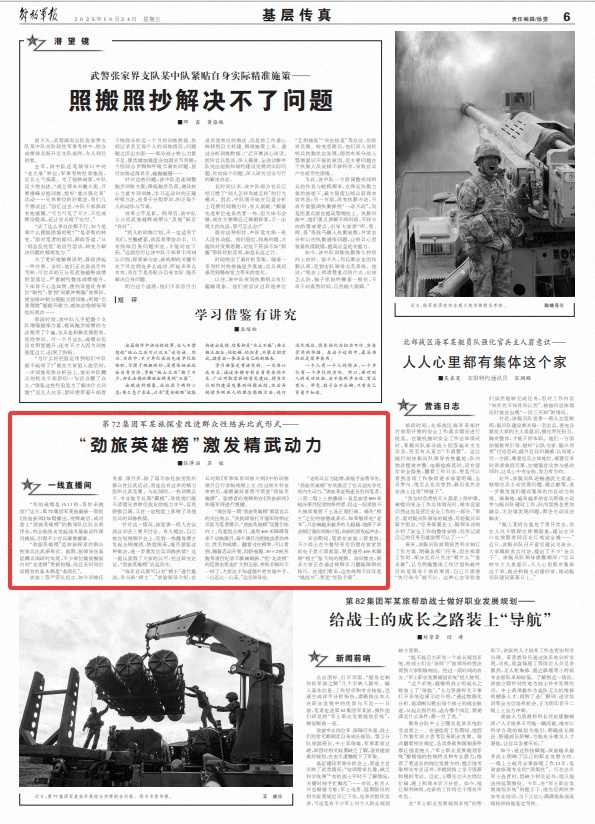 “勁旅英雄榜”是該旅探索的群眾性練兵比武新形式。前期,旅領(lǐng)導(dǎo)在基層蹲點調(diào)研時發(fā)現(xiàn),不少單位樓前櫥窗內(nèi)的“龍虎榜”更新較慢,而且長時間位居榜首的基本都是“老面孔”。