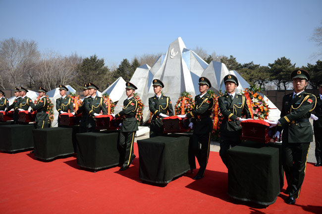 3月21日,禮兵護(hù)送志愿軍烈士遺骸棺槨入場(chǎng)。