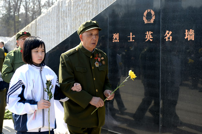 3月21日,小學(xué)生代表和志愿軍老兵向烈士英名墻獻(xiàn)花。