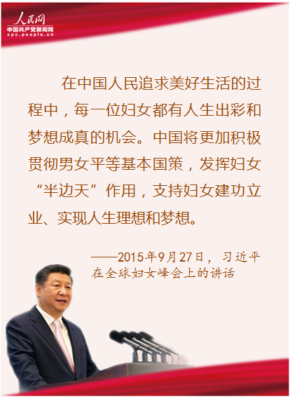 “中國將更加積極貫徹男女平等基本國策,發(fā)揮婦女‘半邊天’作用,支持婦女建功立業(yè)、實現(xiàn)人生理想和夢想?!秉h的十八大以來,以習近平同志為核心的黨中央高度重視婦女事業(yè),習近平總書記在不同場合多次強調(diào)發(fā)展婦女事業(yè)的重要意義,為婦女工作的開展指明了方向。