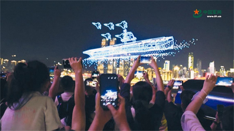 21時(shí)許,伴隨著絢麗的光影和激昂的軍樂(lè)聲,由無(wú)人機(jī)“勾畫”出的一艘航空母艦劈波斬浪而來(lái),隨即,一架架戰(zhàn)斗機(jī)從甲板昂首起飛。不一會(huì)兒,無(wú)人機(jī)群又組成一輛導(dǎo)彈戰(zhàn)車,修長(zhǎng)的彈體緩緩升起,直指天際……