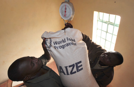 6月24日,在內(nèi)羅畢市郊的馬薩萊貧民窟,“姆賽多-北京小學(xué)”的校長(zhǎng)貝尼迪克特(右)在稱量聯(lián)合國(guó)世界糧食計(jì)劃署捐贈(zèng)的玉米。新華社記者趙穎全攝