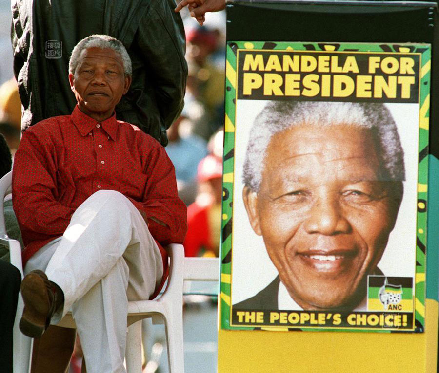 1994年4月23日,非國大主席曼德拉坐在自己南非總統(tǒng)競選海報(bào)旁邊。