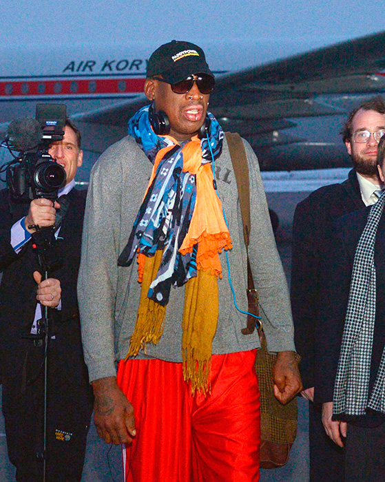 12月19日,前NBA球星丹尼斯·羅德曼(中)到達(dá)平壤機場。新華社/路透