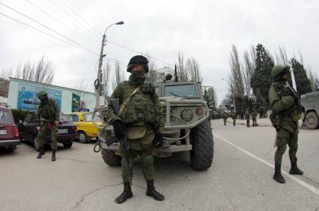 3月1日,在烏克蘭克里米亞自治共和國塞瓦斯托波爾,不明身份的武裝人員包圍一個烏克蘭邊防哨所。新華社照片,法新,2014年3月2日