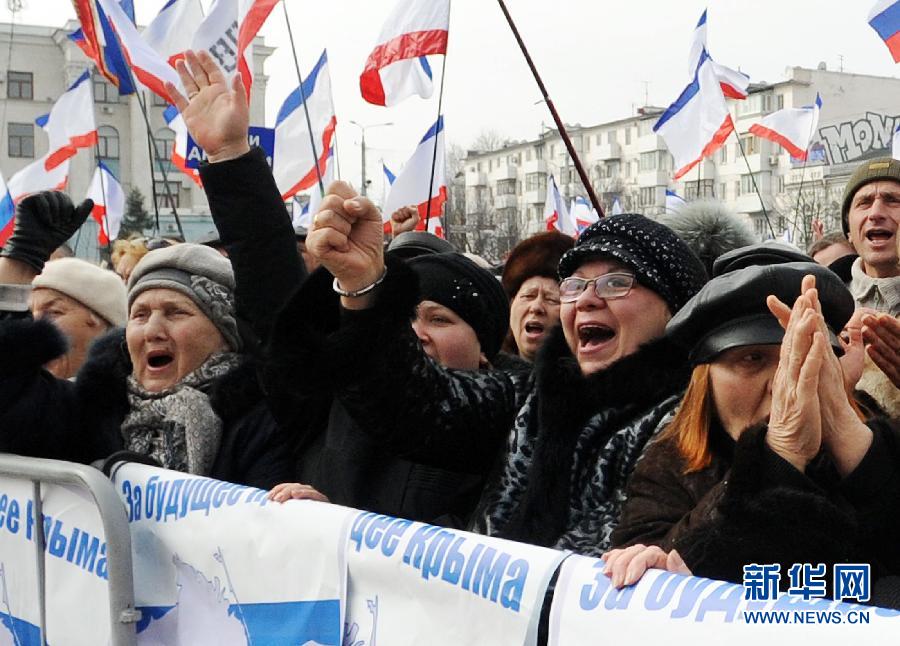 3月9日,在烏克蘭克里米亞的辛菲羅波爾,人們參加親俄羅斯集會。烏克蘭克里米亞自治共和國議會6日決定,將于本月16日舉行關于共和國地位的全民公投。