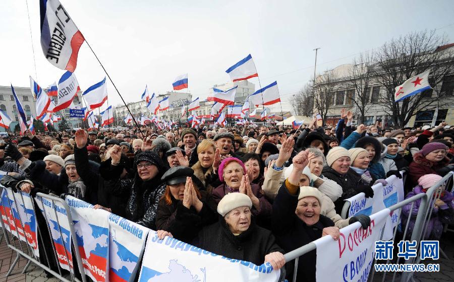 3月9日,在烏克蘭克里米亞的辛菲羅波爾,人們參加親俄羅斯集會(huì)。烏克蘭克里米亞自治共和國(guó)議會(huì)6日決定,將于本月16日舉行關(guān)于共和國(guó)地位的全民公投。