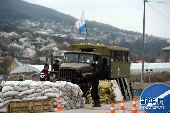 這是3月11日拍攝的從烏克蘭克里米亞辛菲羅波爾市通往塞瓦斯托波爾市途中設(shè)立的檢查站。烏克蘭克里米亞自治共和國最高蘇維埃(議會)11日通過一項決議,批準(zhǔn)關(guān)于該共和國和塞瓦斯托波爾市獨立的宣言。 新華社記者沙達(dá)提攝