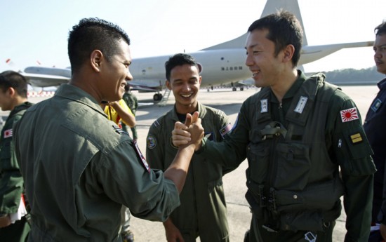當?shù)貢r間2014年3月23日,馬來西亞雪邦,日本海上自衛(wèi)隊員正準備搭乘P3C巡邏機前往澳大利亞海域參與搜救活動。據(jù)悉中國衛(wèi)星在印度洋南部發(fā)現(xiàn)了疑似飛機殘骸,各國搜救隊立刻趕往調(diào)查。
