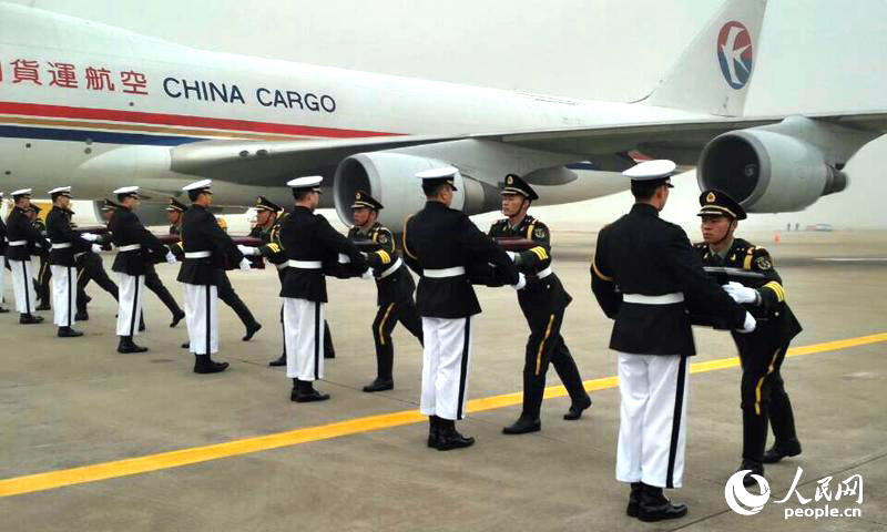3月28日,在韓國(guó)仁川國(guó)際機(jī)場(chǎng),中方禮兵懷抱中國(guó)人民志愿軍烈士遺骸棺槨。根據(jù)中韓雙方達(dá)成的共識(shí),經(jīng)過(guò)相關(guān)部門共同努力,當(dāng)?shù)貢r(shí)間3月28日上午7時(shí)30分,中韓雙方在韓國(guó)仁川國(guó)際機(jī)場(chǎng),舉行在韓中國(guó)人民志愿軍烈士遺骸交接儀式。
