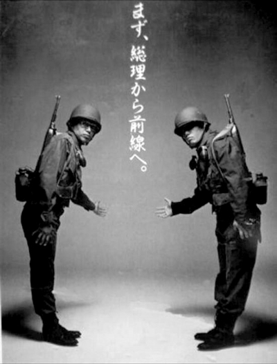 “恭請首相先上前線”是日本一本名為《廣告批評》的雜志,于1982年登載的一張反戰(zhàn)海報廣告詞,海報廣告詞和畫面設計均由日本著名的廣告制作人創(chuàng)作,在日本流傳甚廣。每當有當政者要把日本國民置于危險境地時,就會有日本民眾用這句話表達對于當政者漠視民眾利益的不滿。