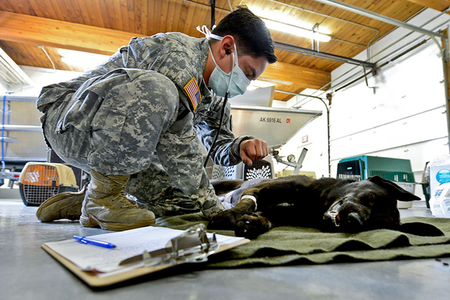 為狗醫(yī)治 2014年4月7日,阿拉斯加科迪亞克島上的軍事獸醫(yī)診所,陸軍軍士杰弗瑞·科特勒在護(hù)理一條進(jìn)行完手術(shù)的狗??铺乩帐且幻称窓z驗(yàn)員,隸屬于華盛頓州劉易斯堡的獸醫(yī)機(jī)構(gòu)的第218醫(yī)療分隊(duì)。