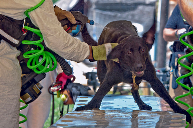 軍犬清潔 2014年8月4日,一條為美軍服役的軍犬Cirque在執(zhí)行完任務(wù)以后被士兵們進(jìn)行身體清潔。