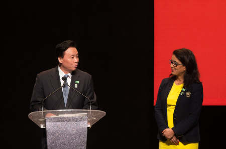 8月5日,中國奧委會(huì)副主席楊樹安(左)在接受國際奧委會(huì)主席巴赫向中國奧委會(huì)發(fā)出的邀請函后致答謝詞。當(dāng)日,里約熱內(nèi)盧在巴拉區(qū)舉行活動(dòng),慶祝2016里約奧運(yùn)會(huì)倒計(jì)時(shí)一周年。 新華社記者 徐子鑒 攝