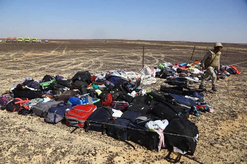 11月1日,在埃及西奈半島哈桑納地區(qū),一名埃及士兵從俄羅斯失事客機(jī)遇難者遺物旁走過(guò)。