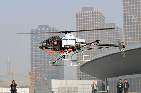 10月17日,工作人員在農(nóng)博會(huì)現(xiàn)場(chǎng)演示低空低量遙控?zé)o人施藥機(jī)。
