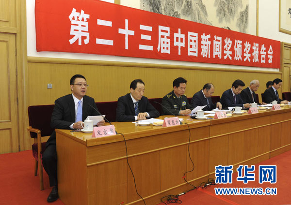 ????11月7日,第二十三屆中國新聞獎頒獎報(bào)告會在北京舉行。這是獲獎代表李柯勇(左一)發(fā)言。 新華社記者 饒愛民 攝