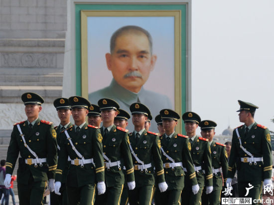 2014年4月27日,北京,孫中山先生的巨幅畫(huà)像亮相天安門(mén)廣場(chǎng),迎接“五一”國(guó)際勞動(dòng)節(jié)的到來(lái)。