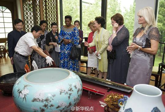 【彭麗媛陪同出席青奧會開幕式部分外方領(lǐng)導(dǎo)人夫人觀賞南京博物院珍貴文物】彭麗媛16日同出席青奧會開幕式部分外方領(lǐng)導(dǎo)人夫人在南京博物院清香閣茶屋,伴隨悠揚(yáng)古琴聲,一邊品茗,一邊觀賞五弦古琴、如意云紋金盤金盞、大雅齋款瓷器、雕漆山水人物紋漆盒等院藏珍貴文物,領(lǐng)略中國古代文化。劉華/黃敬文