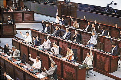 立法會內會最后以35票贊成、25票反對,通過林健鋒動議,引用“特權法”調查非法集結的背后策劃。議案最快可在本月29日的大會討論。