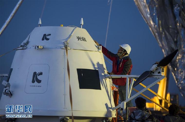光啟集團(tuán)自主研制的“旅行者”2號(hào)飛行器9日22時(shí)44分在新疆試飛,搭載著一名“乘客”——一只烏龜飛向2萬(wàn)米的臨近空間。這是光啟臨近空間載人項(xiàng)目推進(jìn)的重要一步,也是我國(guó)企業(yè)對(duì)近太空旅游服務(wù)和相關(guān)科學(xué)的有益探索。新華社記者江文耀攝
