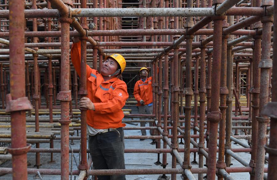 10月1日,中鐵七局西安地鐵五號(hào)線(xiàn)TJSG-12標(biāo)項(xiàng)目部的工作人員在現(xiàn)場(chǎng)施工。 新華社記者 劉瀟 攝