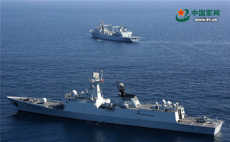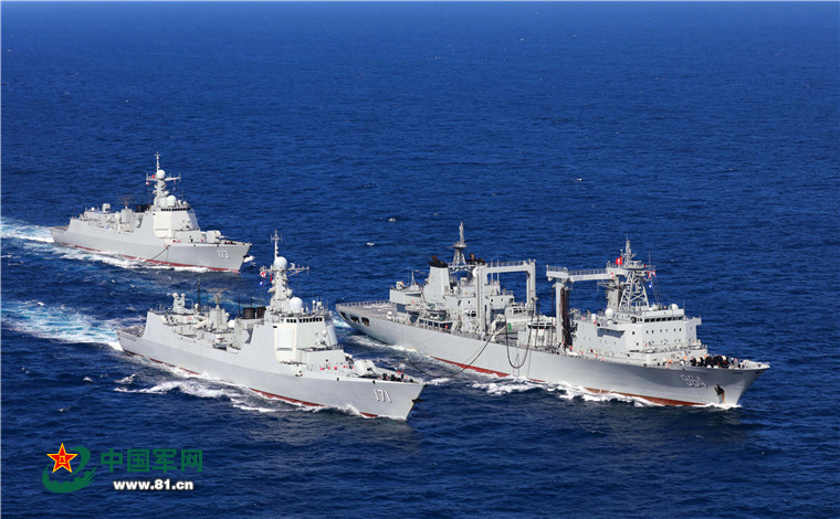 2017年2月下旬,海軍遠(yuǎn)海訓(xùn)練編隊(duì)導(dǎo)彈驅(qū)逐艦長沙艦、??谂?、綜合補(bǔ)給艦駱馬湖艦進(jìn)行航行補(bǔ)給。周啟青 攝