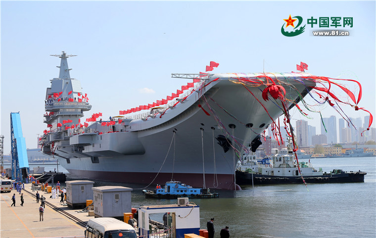 2017年4月26日上午,我國第二艘航空母艦下水儀式在中國船舶重工集團(tuán)公司大連造船廠舉行。這是航母出塢后靠上碼頭。李唐 攝