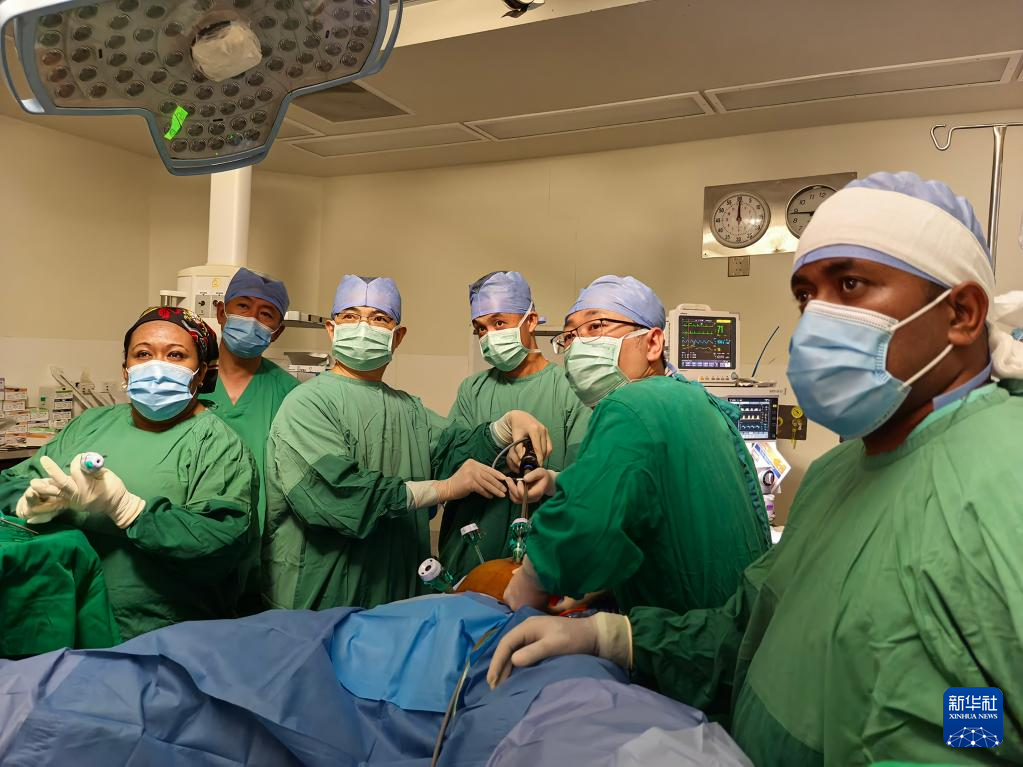 10月6日,在斐濟首都蘇瓦殖民戰(zhàn)爭紀念醫(yī)院,中國海軍“絲路方舟”號醫(yī)院船醫(yī)生與當?shù)蒯t(yī)生為患者進行手術。新華社發(fā)(崔曉洋攝)