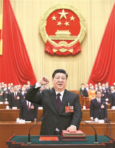 習(xí)近平左手撫按憲法,右手舉拳,莊嚴(yán)宣誓。