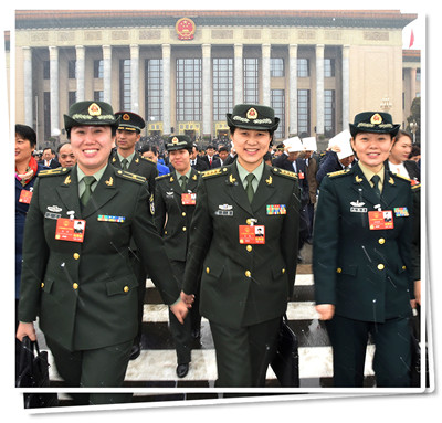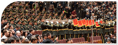 3月17日,十三屆全國人大一次會議在人民大會堂舉行第五次全體會議。上圖為軍隊人大代表迎著飛舞的春雪走出會場。下圖為中國人民解放軍軍樂團號手奏響宣誓儀式曲。