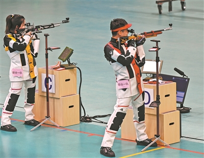 9月13日,聯(lián)合一隊(duì)選手楊倩(左)/楊皓然在比賽中。當(dāng)日,在西安進(jìn)行的第十四屆全運(yùn)會(huì)射擊10米氣步槍混合團(tuán)體決賽中,聯(lián)合一隊(duì)選手楊倩/楊皓然以總分17分的成績(jī)獲得金牌,浙江二隊(duì)選手王芝琳/王岳豐和聯(lián)合二隊(duì)選手張雨/盛李豪分獲銀牌、銅牌。 新華社發(fā)