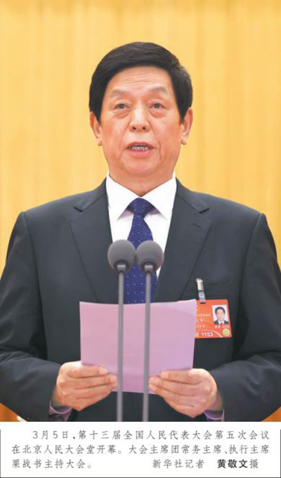 上午9時,栗戰(zhàn)書宣布:中華人民共和國第十三屆全國人民代表大會第五次會議開幕。會場全體起立,高唱國歌。