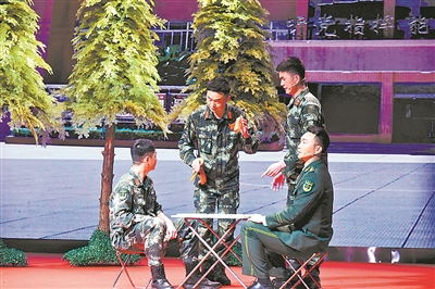 這種場景設(shè)置,體現(xiàn)了該劇成功之處:靠細(xì)節(jié)和人物打動人、感染人。《花開戎杉》里,成熟穩(wěn)重的指導(dǎo)員趙軍、調(diào)皮的新兵杜子騰、愛隊如家的新兵唐曉東等一個個真實豐滿的人物,就像是官兵身邊戰(zhàn)友的“素描”,生動形象,使真實生活與舞臺藝術(shù)交相輝映。這樣的效果得益于話劇故事背后一個先進(jìn)集體多年來的豐富實踐。