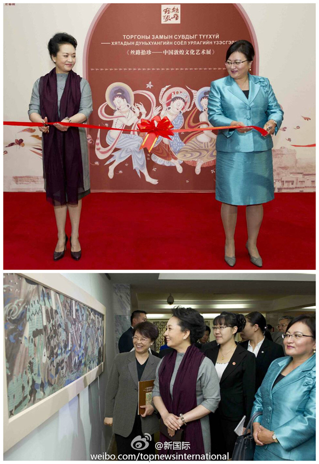 新華網(wǎng)北京8月22日電? 據(jù)新華社“新國(guó)際”微博報(bào)道,習(xí)近平主席夫人彭麗媛和額勒貝格道爾吉總統(tǒng)夫人包勒爾瑪22日上午共同出席為慶祝中蒙建交65周年暨“中蒙友好交流年”舉行的中國(guó)文化周開(kāi)幕式并剪彩,欣賞蒙古國(guó)藝術(shù)家的精彩演出,并參觀中國(guó)敦煌文化藝術(shù)展,觀賞臨摹的敦煌石窟壁畫(huà)、復(fù)制泥塑和樂(lè)器。