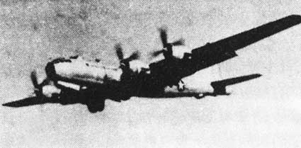 B-29型機(jī)是美國(guó)波音公司生產(chǎn)的中型轟炸機(jī),1942年9月首次試飛。該型機(jī)機(jī)長(zhǎng)30.17米,機(jī)高9米,翼展43米,裝有4臺(tái)2200馬力的“R-3350-79”型發(fā)動(dòng)機(jī),全重62425公斤。最大時(shí)速585公里,巡航時(shí)速366公里,實(shí)用升限9750米,最大航程6757公里,活動(dòng)半徑2400-3360公里,續(xù)航時(shí)間15-20小時(shí),載彈量9080公斤。主要用于執(zhí)行戰(zhàn)略轟炸和遠(yuǎn)程轟炸任務(wù),還可以作反潛、偵察和空中加油機(jī)使用。