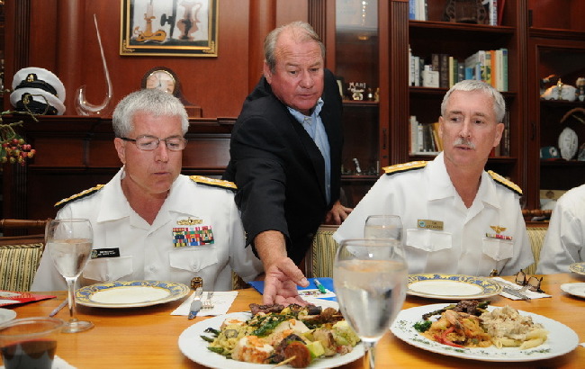 圖為弗羅里達(dá)州奧克蘭公園舉行的艦隊(duì)周廚師大賽:由美國(guó)第二艦隊(duì)司令Daniel P. Holloway中將和東南部海軍司令Tim Alexander少將擔(dān)任評(píng)委。廚師們展示各自的手藝。
