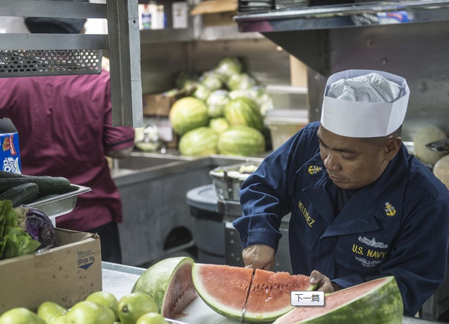 第七艦隊的哈爾西號USS Halsey (DDG 97)阿利伯克級驅(qū)逐艦上首席廚師Joey Melendez正在為晚餐準備西瓜片。
