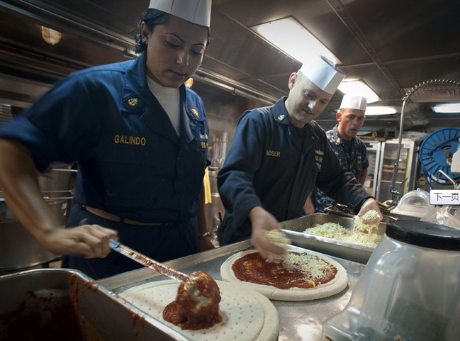 首席火控員Guadalupe Galindo和首席艦體技術(shù)員David Moser在新奧爾良號(hào)兩棲艦上做披薩。