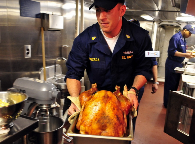 LCS1自由號瀕海戰(zhàn)斗艦首席輪機(jī)電工Raymond Quezada拿著一只的烤火雞。