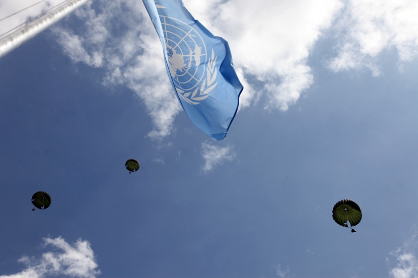 6月20日,在蒙古國首都烏蘭巴托以西65公里處的綜合訓(xùn)練中心,蒙古國士兵在開幕式上進(jìn)行空降演練。新華社記者鄭闖 攝