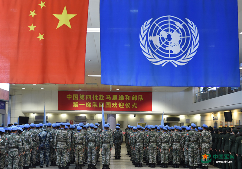 第四批赴馬里維和部隊第一梯隊200名官兵回國歡迎儀式現場。