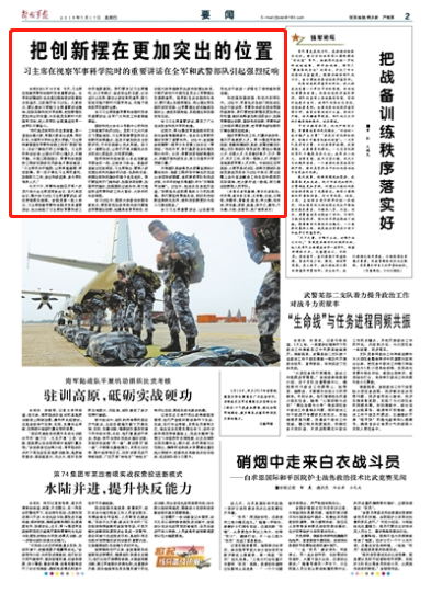 習(xí)主席在視察軍事科學(xué)院時發(fā)表重要講話,全軍和武警部隊官兵通過媒體收聽收看相關(guān)報道后,立即展開學(xué)習(xí)討論。大家表示,要認(rèn)真學(xué)習(xí)貫徹習(xí)主席重要講話精神,加快實施科技興軍戰(zhàn)略,把創(chuàng)新擺在更加突出的位置,為實現(xiàn)黨在新時代的強軍目標(biāo)、把人民軍隊全面建成世界一流軍隊不懈奮斗。請關(guān)注今日《解放軍報》的報道——